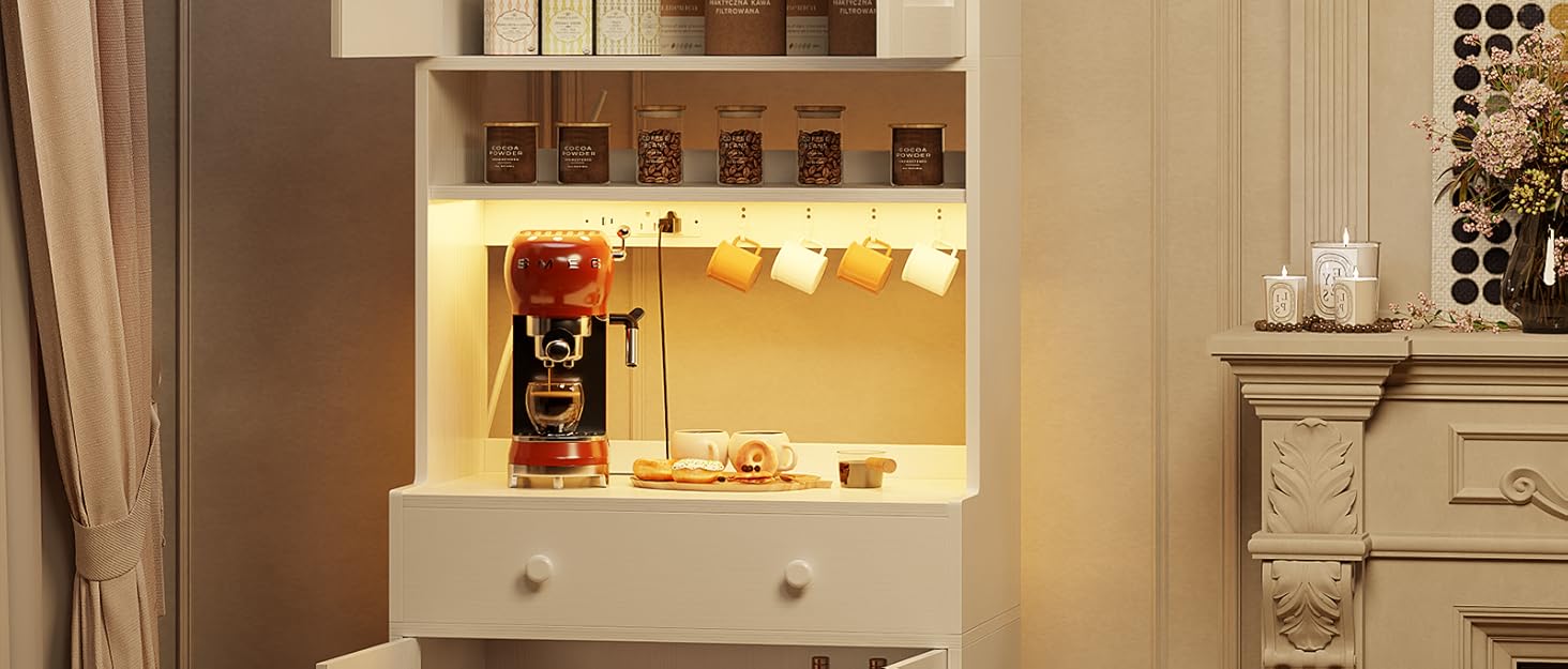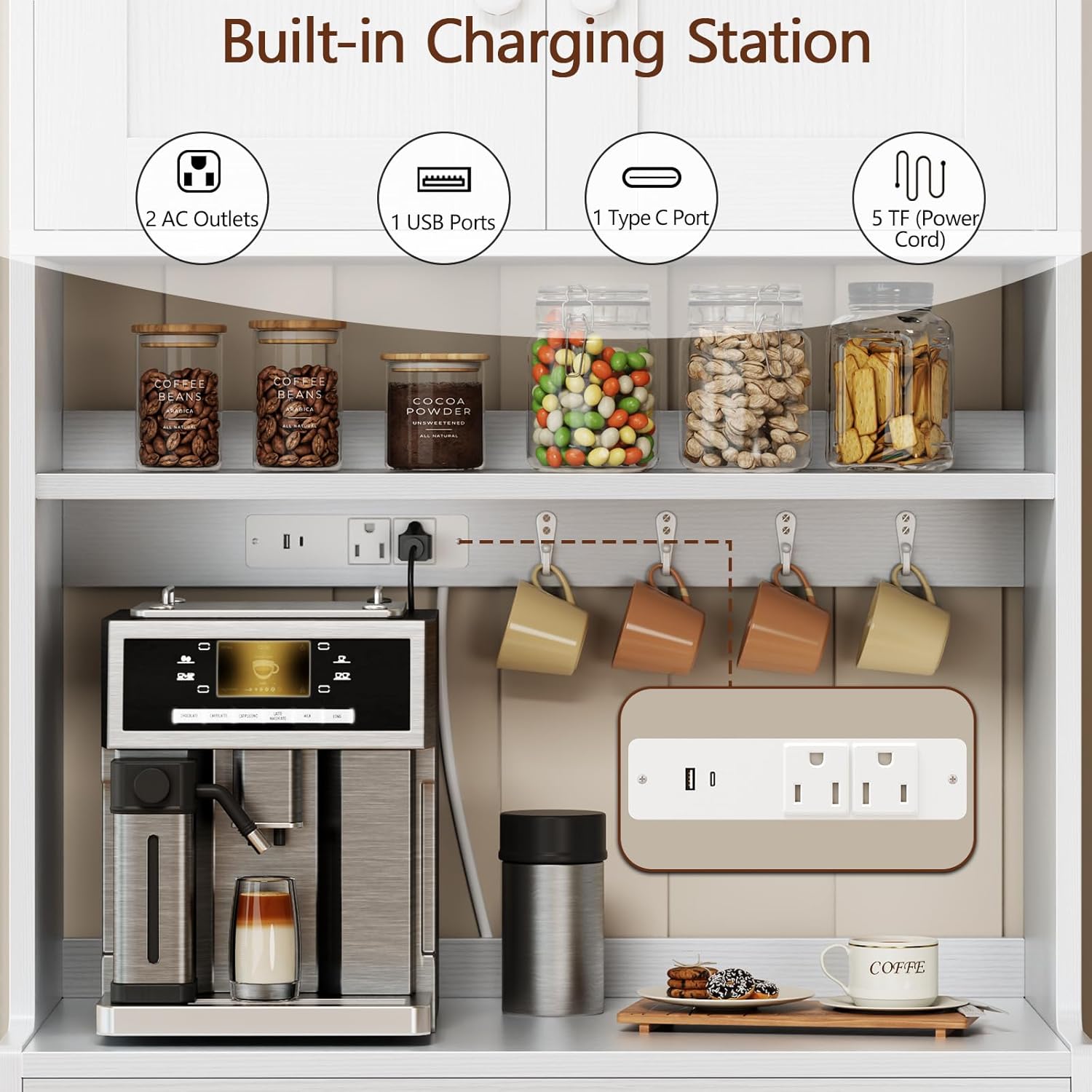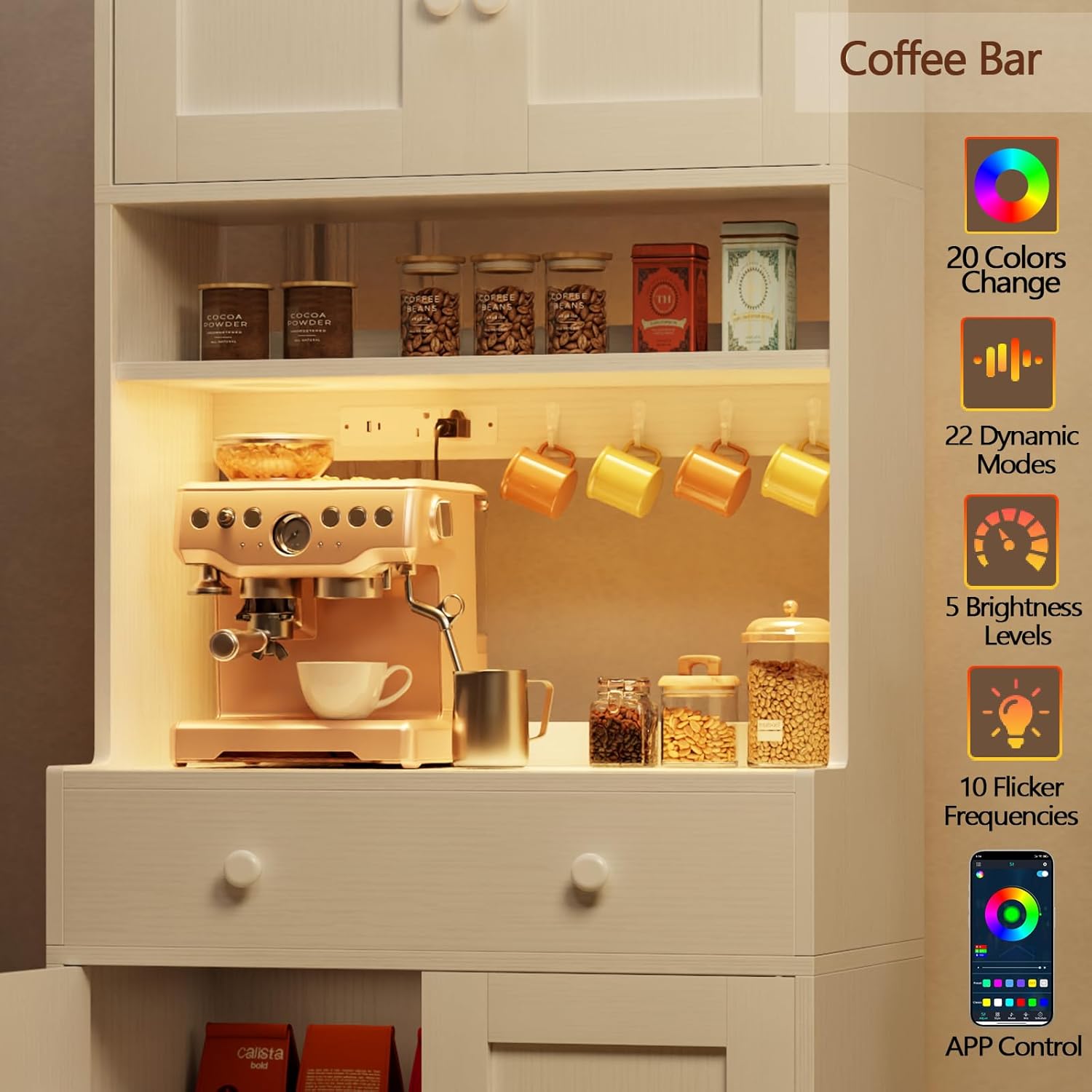 71" Tall Kitchen Pantry Storage Cabinet with Power Outlet & LED Light, Freestanding Food Pantry Cabinet with 4 Doors and Shelves, Cupboard with Drawer, Hutch with Microwave Stand, White