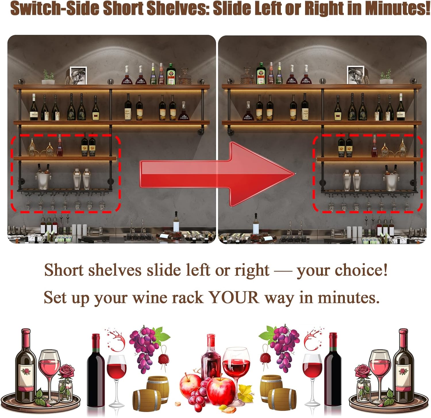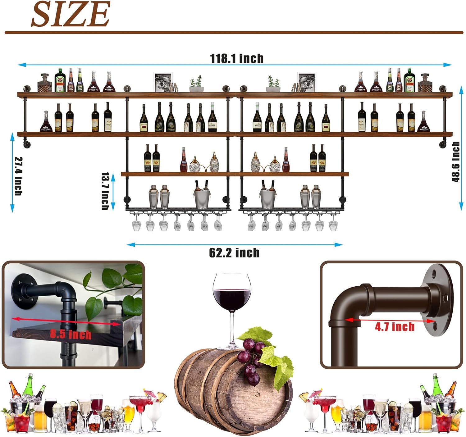 Solid Wood Wall Mounted Wine Rack, Large Wine Rack with LED Light, 4 Tiers Liquor Bottles Floating Shelves with Glass Holder, Industrial Bar Shelves for Home Bar Dining Room (118.1 IN/ 300CM)